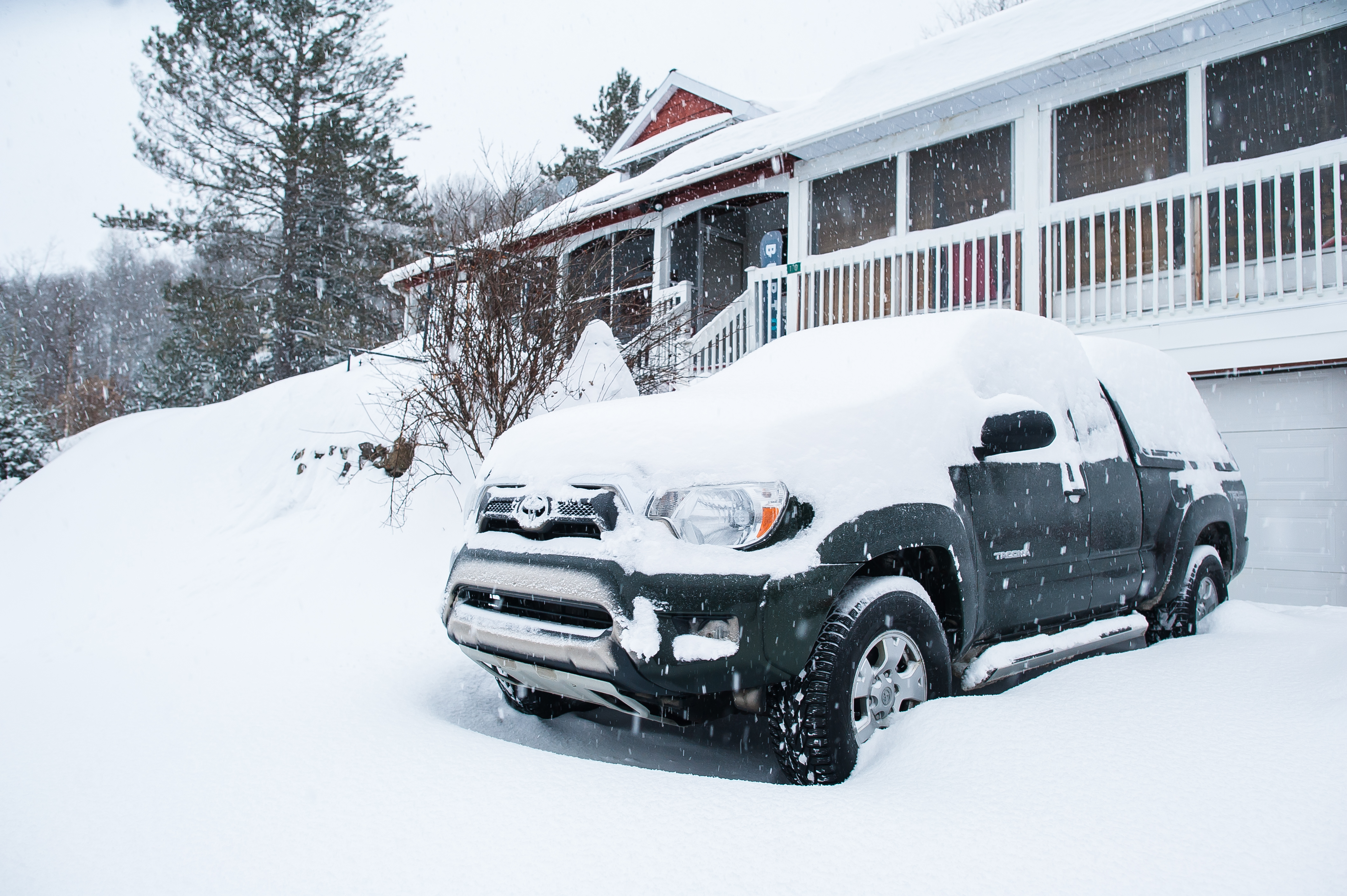 Twenty-nine centimetres fell overnight. At 7 am the next morning (Wednesday) it was still coming down. We had found our way into a friend’s cabin. Crashed inside sleeping bags, so as to not soil the newly laundered sheets. We were out of his, and his family’s, hair at first light. But not before turning the truck slideways in the driveway. I had hung the Taco up on the 4 foot snow banks that straddled the tunnel that was passing for a “driveway.” We pulled out our avy shovels and dug out the truck using the companion rescue method: one chops the other clears trading-off every few minutes. Half an hour later the snare finally released us to ride the unicorn of East Coast skiing: a powder day.